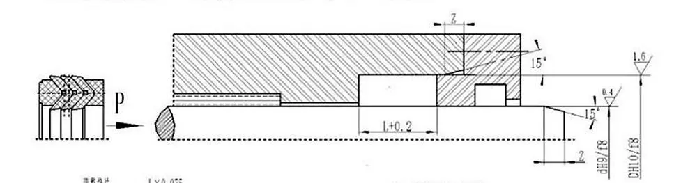 உகந்த சீல் மற்றும் உராய்வு அடைய கேஸ்கெட்டை சரிசெய்வதன் மூலம் V- வடிவ முத்திரைகளை அச்சு பரிமாணத்தில் சரிசெய்யலாம். நீண்ட கால செயல்பாட்டிற்குப் பிறகு ஆரம்ப உடைகள் அச்சு பரிமாணத்தை சரிசெய்வதன் மூலம் நீட்டிக்கப்படலாம். சரிசெய்யக்கூடிய முத்திரை குழியின் அச்சு பரிமாணத்திற்கான பரிந்துரைக்கப்பட்ட வடிவமைப்பு 1.025L ஆகும், சரிசெய்தல் வரம்பு 7.5%L ஆகும்.