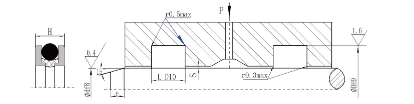 | துளை வரம்பு டி எச் 9 | பள்ளம் விட்டம் டி எச் 9 | பள்ளம் அகலம் எல்+0.2 | முத்திரை உயரம் எல் 1 | வட்டமான மூலைகள் Rஅதிகபட்சம் | ரேடியல் அனுமதி கள் | சேம்பர் Zநிமிடம் | ஓ-ரிங் கம்பி விட்டம் டி 0 | ||