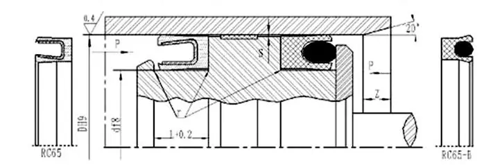 RC65-40-PTFE4+V: துளை விட்டம் 40, சீலிங் ரிங் மெட்டீரியல் PTFE4, ஸ்டெயின்லெஸ் ஸ்டீல் ஸ்பிரிங் என்பது V வடிவ ஸ்பிரிங்.