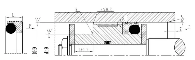 துளை வரம்பு நிலையான வகை டி எச் 9 RC2062 | துளை வரம்பு கனமான வகை டி எச் 9 RC2062-Z | பள்ளம் விட்டம் டி எச் 9 | பள்ளம் அகலம் எல்+0.2 | முத்திரை அகலம் எல் 1 | சுற்று மூலைகள் rஅதிகபட்சம் | ரேடியல் அனுமதி கள்அதிகபட்சம் | சேம்பர் Zநிமிடம் | ஓ-ரிங் கம்பி விட்டம் | ||