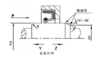 2. சுழலும் தண்டு மற்றும் பள்ளங்களின் வடிவமைப்பு: தண்டு மேற்பரப்பு மென்மையாகவும் பர்ர் இல்லாததாகவும் இருக்க வேண்டும். சுழல் எந்திர மதிப்பெண்கள் ஒரு உந்தி விளைவை உருவாக்கலாம், இது கசிவுக்கு வழிவகுக்கும். ஆயில் சீல் பொருத்தும் பகுதியானது Ra0.1-0.5µm மேற்பரப்பு கடினத்தன்மைக்கு தரைமட்டமாக இருக்க பரிந்துரைக்கப்படுகிறது, மேலும் வேகம் அதிகரித்து மென்மையாக மாறும். எளிதாக நிறுவுதல் மற்றும் பிரித்தெடுப்பதற்கு, தண்டு மற்றும் பள்ளங்கள் அறைகள் அல்லது வட்டமான விளிம்புகளுடன் வடிவமைக்கப்பட வேண்டும், படம் 1 மற்றும் 2 ஐப் பார்க்கவும்.